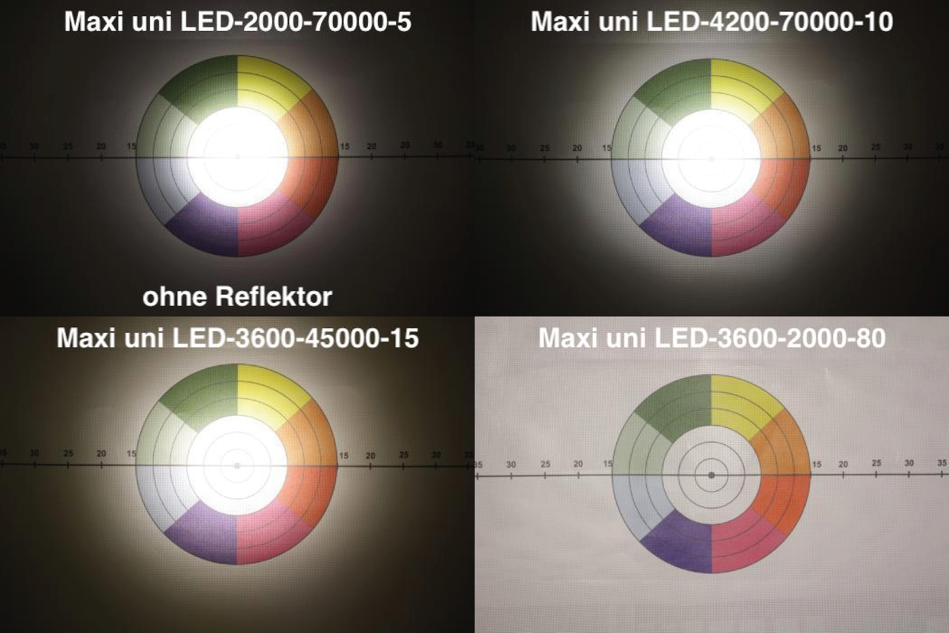 Ein Lampenkopf, viele Möglichkeiten. Vom 5 Grad Lichtschwert, über den 15 Grad Allrounder bis zur 120 Grad Videoleuchte.